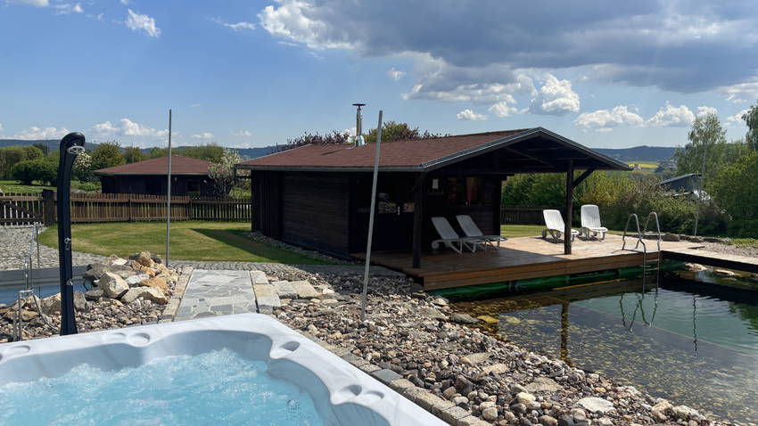 Wellnessurlaub in Bayern mit Hot-Tub Whirlpool, holzbefeuerter Sauna im Blockbohlenhaus am Bio Schwimmteich. Ideal auch für Gruppen.