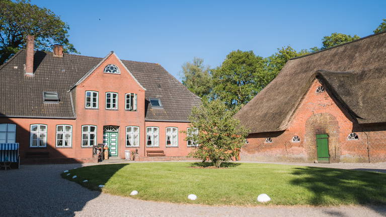 Unser wunderschöner alter Hof mit angrenzendem Ferienhaus liegen in der Nähe von St. Peter Ording mitten in den grünen Feldern.