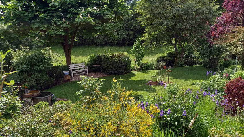 - Natur pur vor der Haustür: Der großzügig angelegte Garten mit seinem sanft plätschernden Bachlauf lädt zum Verweilen und Durchatmen ein.