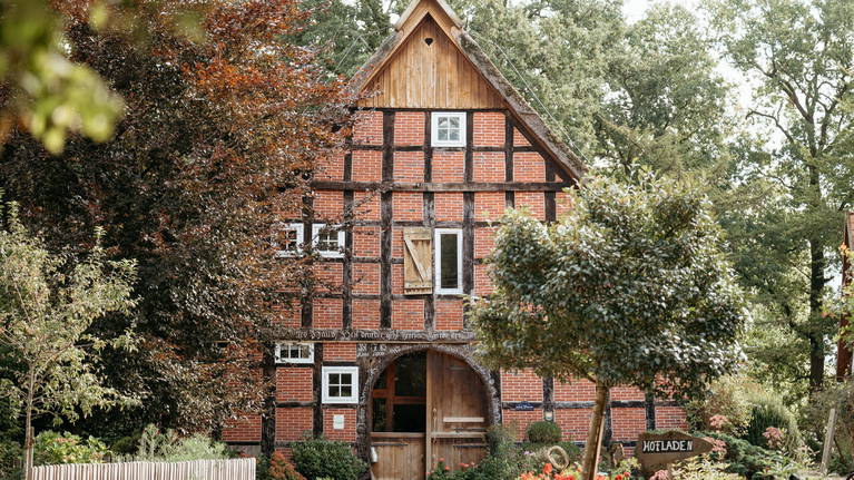 Eine bunte Vielfalt an Bäumen, Sträuchern, Kräutern und Blumen ist im großen Garten und über der ganzen Hof verteilt. Historisches Fachwerk mit dem reetgedeckten Haupthaus prägt das Bild. Es herrscht eine wohltuende Ruhe.